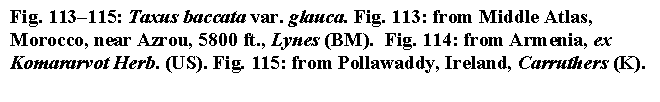 Pilger (1916) acknowledged Knight (1850) as an earlier authority for the name—horizontalis—rather than glauca based on Carrière (1855). However, Knight’s (1850) descriptive information on T. baccata var. horizontalis, plants producing “large horizontal branches,” was in context of comparing landscape effects of conifers rather providing taxonomic descriptions; his table of species and varietal names—including this variety—are not differentiated—except for symbols that classify the taxa as either a tree or a shrub. Representative Specimens—Algeria: Atlas de Blida, Univ. Algeria, Apr 1912 (NA); Atlas des Demia, Gamble (K). Morroco: Middle Atlas, Azrou, 5700 ft, Lynes (BM); Ifrane 1400 m, Trethewy 85 (K); Ifrane, 1600 m, Lewalle 12378 (BM). Ireland: Pollawaddy, May 1961, Carruters (K). England: Norfolk, Elsing, monoecious, Vulpy (K). Sweden: Göteborg, Sep. 1900, Thedenius (PH, US); Podermanlane, Bjornstrorn, ex Mus. Stockholm (US). Finland: Aland, par. Lemland, in insula Jungfruskár, Vidlund, Finlandee Exsic. 419 (K, p.p., bottom specimen). Switzerland (Helvetica), Interlaken, in Walde bei Unterseen, 550 m, 30 May 1904, C. Baenitz s.n., annotated T. baccata f. pendula (US: 1395580). Austria: Keck (US). Italy: Cultivated, Tuscany, Villa Rice to San Mercallo, shrub or tree to 30 ft, McDonald: I-37 (US). Albania: Baldacci 169 (K). Turkey: Paphalogonia: Wilajet Kastanbuli, 1892, Sintensis 5118 (K, P). Syria: 1000 m, Nov. 1935, Delbés (P). Armenia: locality in Russian, 22 Mar 1946, Inst. Bot. Acad. Sci. Armenia (US); Tschunakuchi, ex Herb. Petropolitani, Szovich 610 (P).