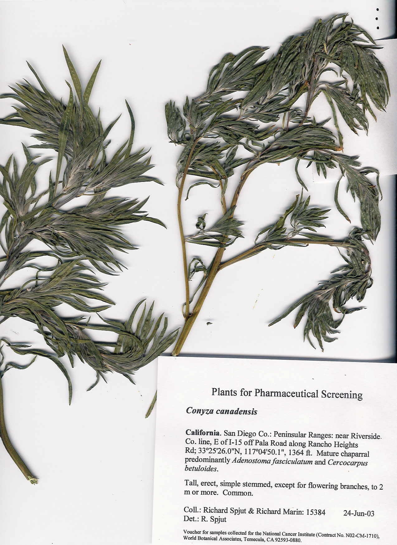 Pacciaroni A. V. , E. Mongelli, L. Ariza Espinar, A. Romano, G. Ciccia and G. L. Silva. 2000. Bioactive constituents of Conyza albida. Planta Med. 66(8): 720–723. “The bioactivity-guided fractionation of an active chloroform extract of Conyza albida led to the isolation of three alkenynes, deca-4,6-diyn-2-(Z)-enoic methyl ester (1), deca-4,6-diyn-2-(Z)-enoic ethyl ester (2) and deca-2,4-diene-4-hydroxy-6-yn-1,4-olide (3), and the terpenoid spathulenol (4), as the active toxic metabolites in the Artemia sp. lethality test. When tested in the KB cell cytotoxicity assay, compounds 1-4 demonstrated IC50 values of 52.2, 38.4, 117.9, and 83.8 microM, respectively. All compounds studied were inactive in the DNA methyl green and DNA strand scission assays, while compounds 3 and 4 showed moderate activity as inhibitors of human topoisomerase I. Compound 2 is reported here for the first time.” |