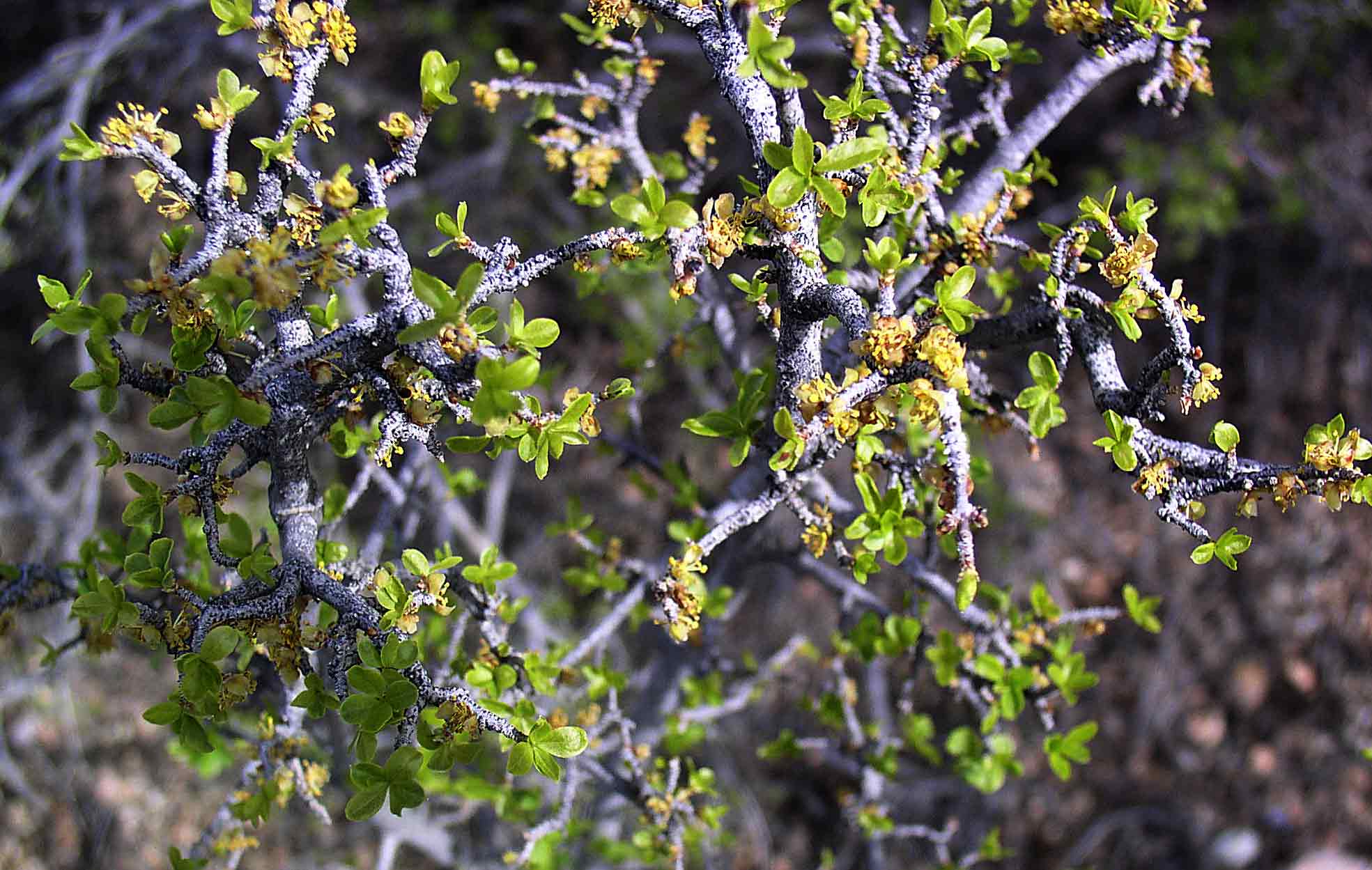 Trees and Shrubs of Kern County (Jan 2013) Forestiera. Deciduous shrubs with opposite leaves often in clusters; flowers unisexual on same or different plants, without sepals, often without petals; fruit: drupe with 1 or 2 seeds. ±20 species, desert and tropical regions of the New World Forestiera pubescens Nuttall 1835 var. parviflora [Forestiera acuminata (Adelia acuminata Michaux 1803) Poiret 1812 var. parviflora A. Gray 1860) Nesom 2009 [Includes Forestiera neomexicana A. Gray 1876]. Desert olive. Large shrub or tree with a short trunk, densely branched from near base, branches opposite, rigid, often short—at right angles in the upper part of the plant; leaves deciduous, appearing with or after the flowers, in clusters (fascicles), short elliptical to spoon-shaped; flowers Mar-Apr, mostly unisexual on separate plants, occasional ones bisexual, sepals and petals lacking; fruit ovoid, fleshy (drupe), bluish black, 5–7 mm, 1-seeded. Scattered shrubs or massive thickets in washes, widely distributed from the valley to Colorado, Texas, and Mexico. Type from steep rocky banks of the Rio del Norte, near Santa Fe, NM]. Desert olive patches recognized in MCV2 when >50% relative cover in the shrub layer. Kern Co.: “Occasional in moist places in canyon bottoms from the desert ranges through the arid mountain slopes to the Temblor Range; west to Kernville” (Twisselmann). Thicket for nearly one-half mile in a steep ravine leading to Jawbone Canyon (pers. obs. 2011). The typical variety in Oklahoma, Texas and Mexico (Coahuila, Nuevo Leon).