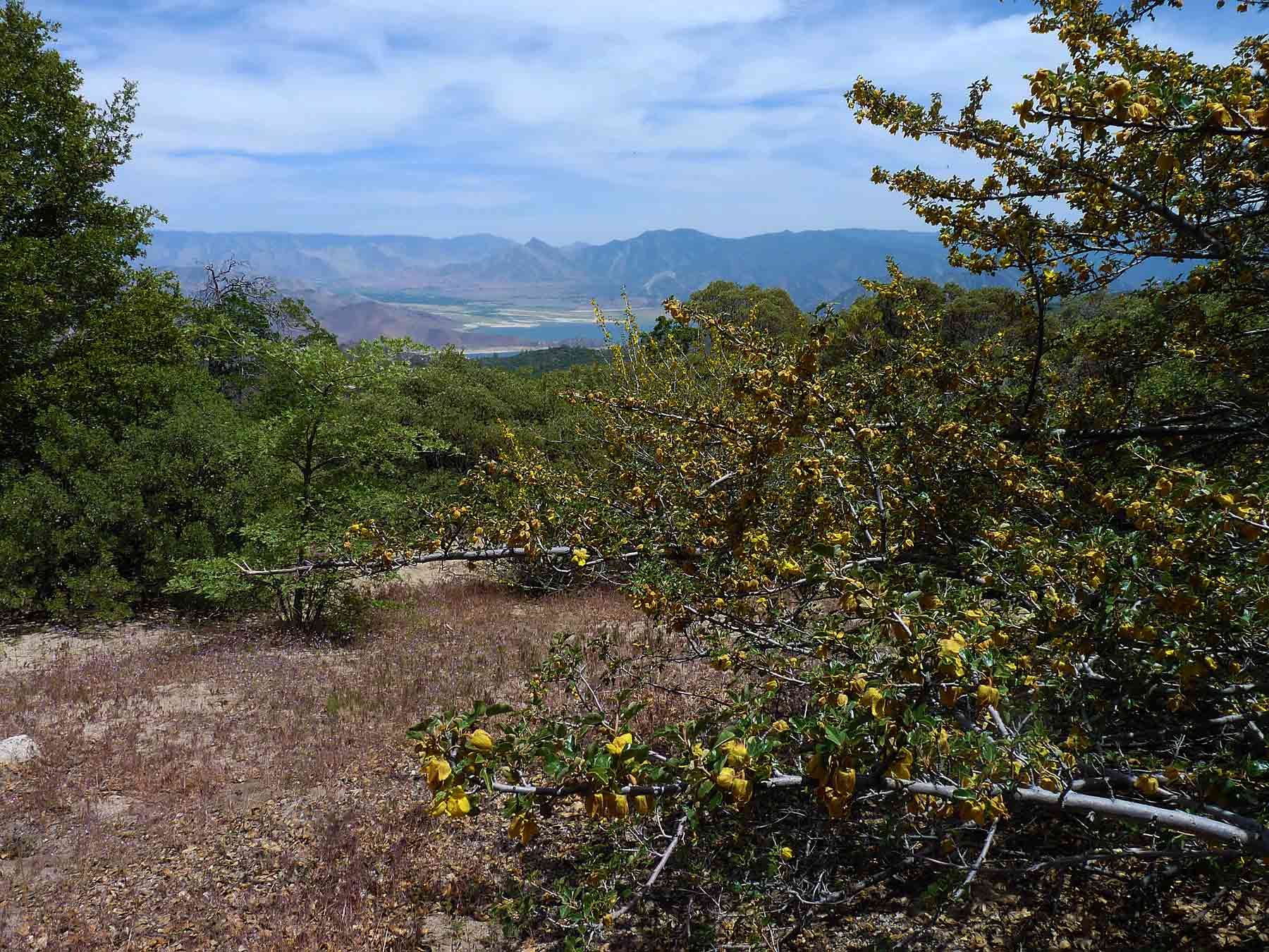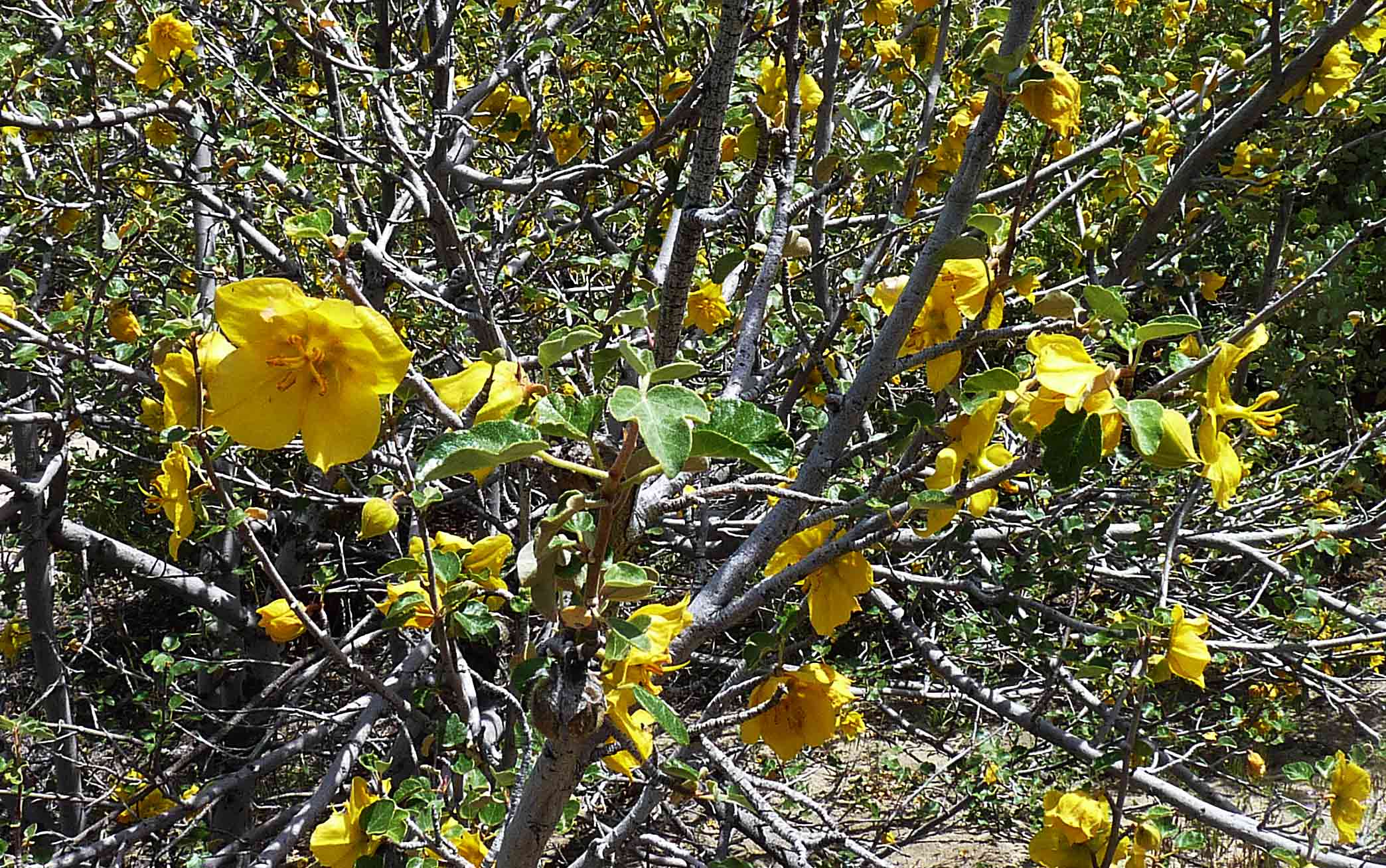 Trees and Shrubs of Kern County (Jan 2013) Fremontodendron californicum (Fremontia californica Torrey 1853) Coville 1893. Flannel bush (also classified in Sterculiaceae). Shrub or tree; stems often many arising from near base, to 5+ m; leaves simple, alternate, generally heart-shaped with undulating lobes, green above, densely golden below; flowers Apr–Jul, yellow (sepals); ovary 4–5-celled; fruit a loculicidal capsule, opening by 4–5 valves, stiff hairy. California woodlands and open chaparral on rocky slopes to western slopes of desert regions, 2,500–7,000 ft; from just north of Redding south to Sierra San Pedro Mártir in Baja California. Type from “sources of the Sacramento, in the northern part of the Sierra Nevada.” Kern Co.: Common throughout the woodland and forest regions, often on rocky slopes, 518–2,287 m. Contact with hairs on this plant may cause an allergic reaction. Infusion of bark used to relieve irritation of the throat (Krochmal et al. 1954). Two other species in the genus occur in California, Baja California and Arizona.
