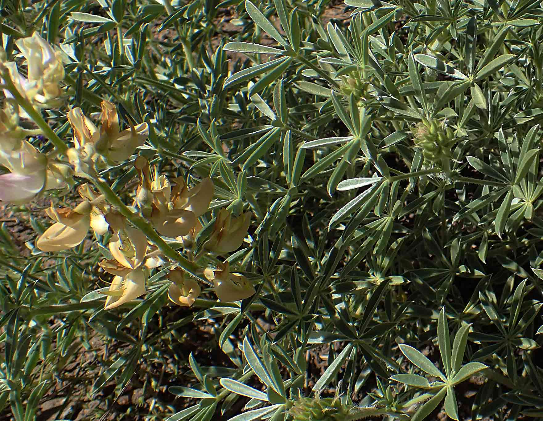 Lupinus. Annual to perennial herbs, subshrubs, or shrubs with usually digitately divided leaves, terminal racemes or whorls (verticels) of flowers, and dehiscent fruits (legumes). Leaves deciduous, alternate above base, the petiole distinct, dilated basally, leaflets 3–17. Flowers clustered along stem in verticels in which they arise at the same level around the stem, a whorled arrangement, or slightly at different levels within a verticel, an irregular or subwhorled verticel, or mostly alternate, the arrangement when uniformly distributed referred to as racemose; individual flower bilateral (papilionaceous) with 5 petals, differentiated as banner separated from two lower petal wings generally joined at margins surrounding a keel that may be partially exposed, banner grooved down the middle, the sides reflexed backwards like elephant ears, often centrally differentiated by color (“banner spot”), subtended by a bilateral calyx. ±267 species, not easily distinguished, concentrated in Mediterranean climate regions (not in Australia). Contains toxic alkaloids; 17 species reportedly used in native American medicine, uses relatively few for each species, frequently mentioned—blisters (especially from poison ivy), nose bleeds, and eye medicine prepared from pounded seed in water (Moerman); 208 extracts screened by the NCI for antitumor activity prior to 1980, only one active (PS tumor assay) from aerial parts of L. micranthus Gussone 1828 (NCI record name, L. hirsutus L.) collected in Kenya. Parts of the lupine flower might be compared to a sail boat, the banner representing the sail, the hull formed from two lateral wings, and the keel of two fused petals, which in the boat is below the hull, but in the lupine flower is covered by the lateral wings. Key characters involving hairiness and shape of the keel best seen by removing the wings. Tom Chester presents labeled photographs for key floral characters of Lupinus. Illustrations for most species can be found in Abrams (1944, by Charles Piper Smith) and in JM2 and Jepson eFlora. Many California perennial species of Lupinus are not clearly differentiated, including two woody species in Kern County, L. albifrons and L. excubitus, together referred to as the L. albifrons species complex (Huang & Friar 2011). For example, Lupinus excubitus was initially considered a rare species confined to Inyo County (Jepson 1919, 1936; McMinn 1939). Its circumscription has since broadened to encompass five varieties (Sholars in JM1, JM2, eFlora), many of which overlap geographically and morphologically with L. albifrons that includes three to five varieties (Smith in Jepson 1925, Abrams 1944, Munz 1959, Sholars supra); the overlap appears greatest in Kern County where most California floristic subregions and geologic provinces merge, which borders on where L. albifrons reaches its greatest diversity—in the Transverse Ranges (Huang & Friar 2011). It may be further noted that Jepson (1936) transferred the varieties of L. excubitus to L. albifrons and distinguished the species only by geography. A phylogenetic analysis of DNA chloroplast genes of the Lupinus albifrons complex obtained from ten widely scattered locations in California—that included 15 other related perennial species totaling 31 taxa—found that L. excubitus var. excubitus plants from the Eastern Sierra Nevada and var. hallii plants from the San Gabriel Mountains grouped into a distinct clade separate from all the other samples of perennial species and varieties of the L. albifrons complex (Huang & Friar 2011). Except for L. paynei discussed below, the species and varieties within L. albifrons group were not clearly separated. It was suggested that the whole subgroup be regarded a single species, L. albifrons with no varietal distinction (Huang & Friar 2011). Additionally, the Albifrons group included a clade of annual species, L. nanus and L. bicolor, ‘nested within the western North American perennial species, essentially splitting the perennial species into two main main clades’ (Huang & Friar 2011); however, Drummond et al. (2012) showed the annual species (nanus, bicolor, pachylobus) in a sister clade to the perennial species nested within an overall phylogeny (tree, 122 species) of the genus (~267 species), in which they suggest that the perennial species were derived from lowland annual species spreading into montane environments. It should be recognized that phylogenetic interpretations from molecular data that involve more intensive sampling of closely related species within a genus—represented by multiple samples of each species or variety from different locations (Huang & Friar 2011)—can reveal more complex relationships, in contrast to limited sampling that may exhibit species resolution (Drummond et al. 2012). For example, in the Huang and Friar study (2011), only two perennial lupine species were distinguishable in the Albifrons group of 16 morphologically defined species, L. albifrons and L. paynei, in contrast to eleven of the same morphological species differentiated across four internal nodes ( > .90 support) in the Drummond et al. (2012) study (excubitus, latifolius, formosus, albifrons; albicaulis; arboreus, chamissonis; argenteus, polyphyllus, andersonii, leucophyllus). The Jepson Manual treatments by Sholars (1993, 2012, eFlora accessed Aug 2016 ) distinguished varieties within the Lupinus albifrons complex by the crescent shaped keel (relatively narrow, tapering gradually to base and apex, L. albifrons), in contrast to a “lobed” keel (relatively broad, abruptly tapered to base, L. excubitus); however, this difference is preceded by two of the varieties distinguished by the absence of hairs on the banner, L. excubitus var. austromontanus and L. albifrons var. collinus, or by the lack of hairs along the upper margin of the keel, var. collinus; the latter then distinguished by the smaller flowers (10–16 mm vs 14–18 mm; Jepson 1936; JM2, Jepson eFlora)