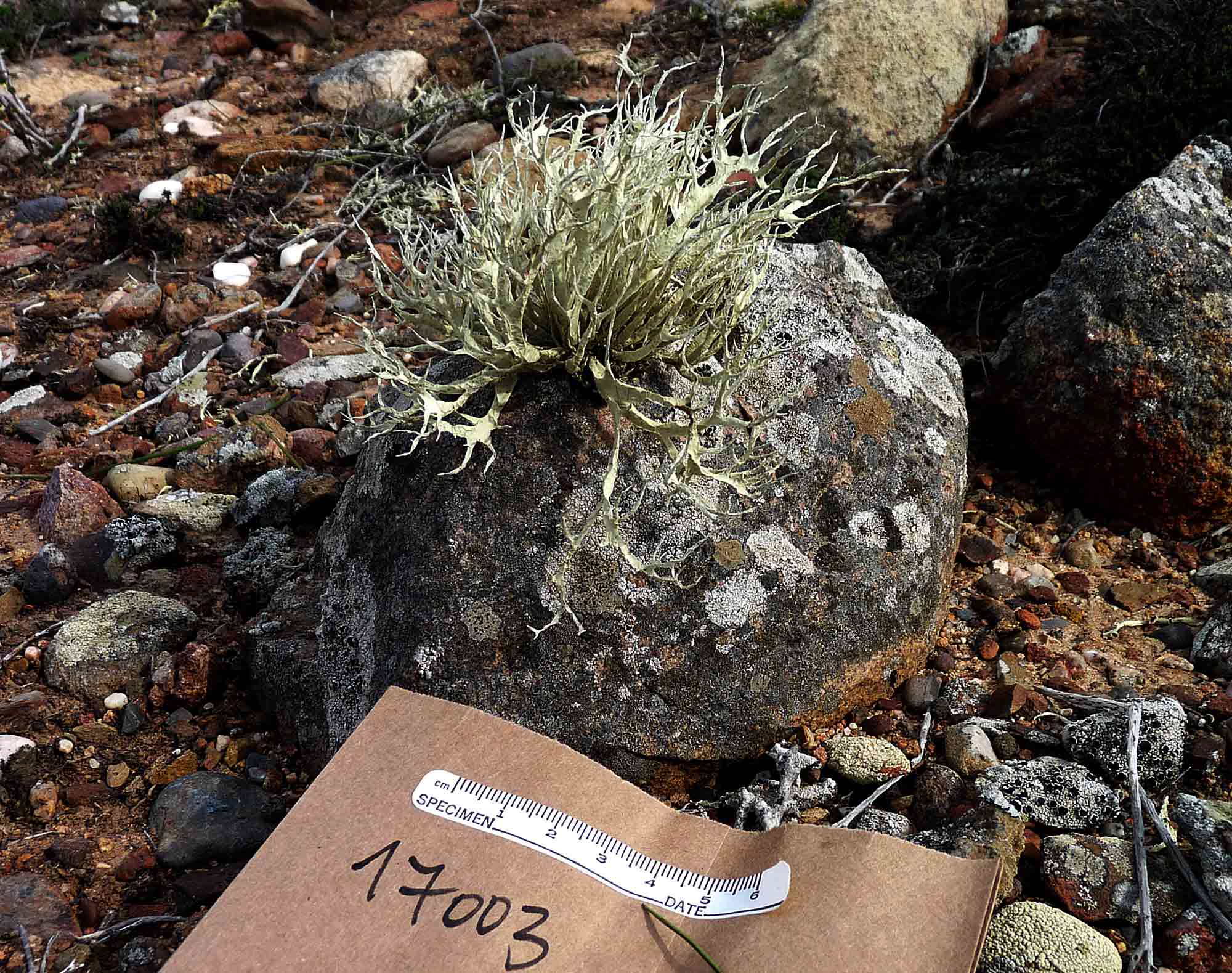 On rocks near sea level 17054 from near San Quintín (SQ) shown in the above image and 17078 shown to the left. 17078 collected near Punta Baja, and 17295 from Morro Santo Domingo shown below; all appeared nested within the depsidone clade instead of the sekikaic acid clade, or in a separate clade. TLC showed both salazinic acid and sekikaic acid accompanied by triterpenes for all three specimens. Additionally, 17078 showed protocetraric acid with triterpenes in another TLC run